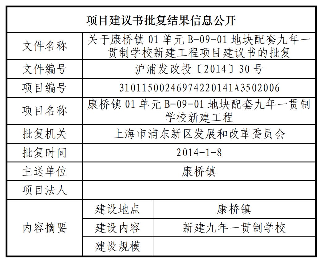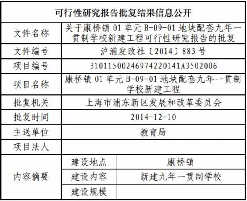 关于康桥镇01单元B-09-01地块配套九年一贯制学校新建工程调整可行性研究报告的批复