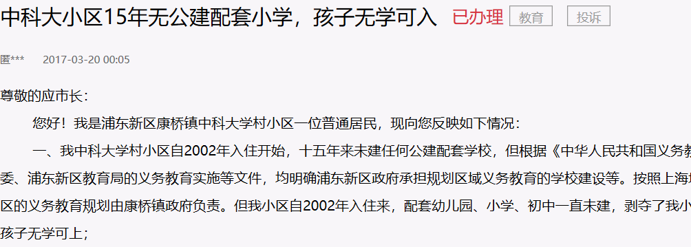 这十几年来,康桥开发了众多商品房,但却在规划公建配套学校未建的情况下,即允许开发商向社会销售,由此引入了大量人口,其中不少是外地引进人才或经商办企业的生意人,原有公立学校无法容纳大量新增学龄儿童,导致义务教育学位长期严重不足。