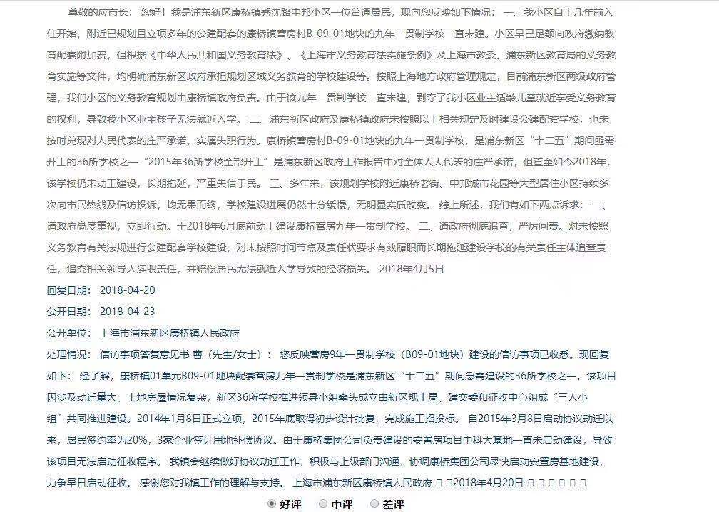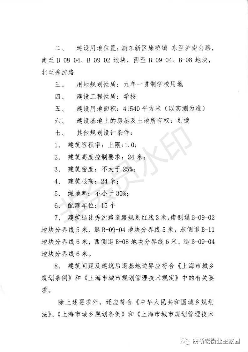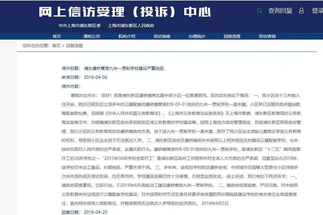 家长们称,浦东新区康桥镇康桥路地块,没有配套小学,很多孩子上学要被调剂到5公里远的高青路。附近的孩子对口小学需要单次步行40分钟左右,初中需要单次步行60分钟。几十万居民都在等着这所九年一贯制学校的建成。